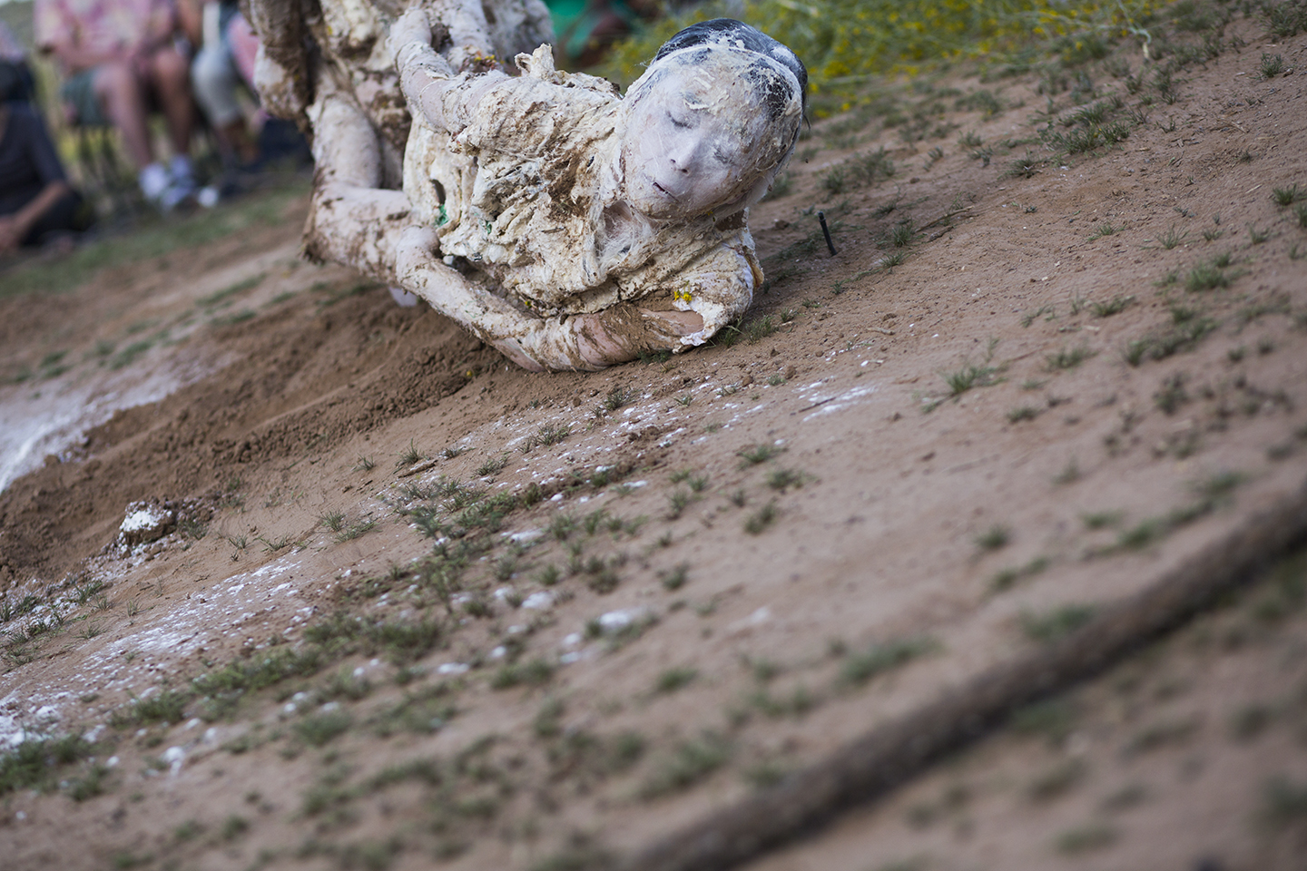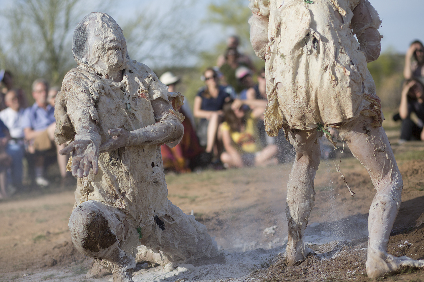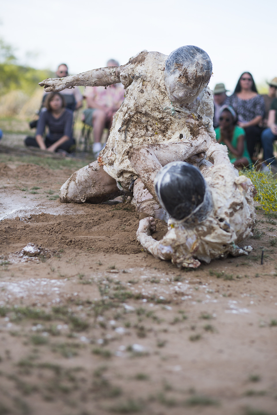 We were escorted as a group to the area the performance would take place. There was a small circle with a pile of dirt in the center covered in candles and Eiko laying still in the center in the bright sun. A large bunching of palo verde branches were piled into one area of the scene and dried pieces of ocotillo and wood created the performance space. Koma hobbled/walked into the circle with a large stick and candles lit on the end. He lit the cake of earth and slowly began to interact with Eiko. They had created three small wells, each holding different materials. The first water, secondly a white mud-like substance and lastly a powder. After some time they began to give each other first the water, then the mud and finally powdered themselves. Their movements were slow and akward, reminding me of a placid horror movie set in the Arizona desert. I couldn’t begin to understand the decisions governing each movement, but I found the point is for the viewer to create their own interpretation of the scene. I still don’t know what to think, two days after the performance, but I enjoyed the idea of utilizing such strange and alien movements in a performance. I suppose it makes you question the idea of what constitutes beauty in performance and provides you with more questions than answers.
