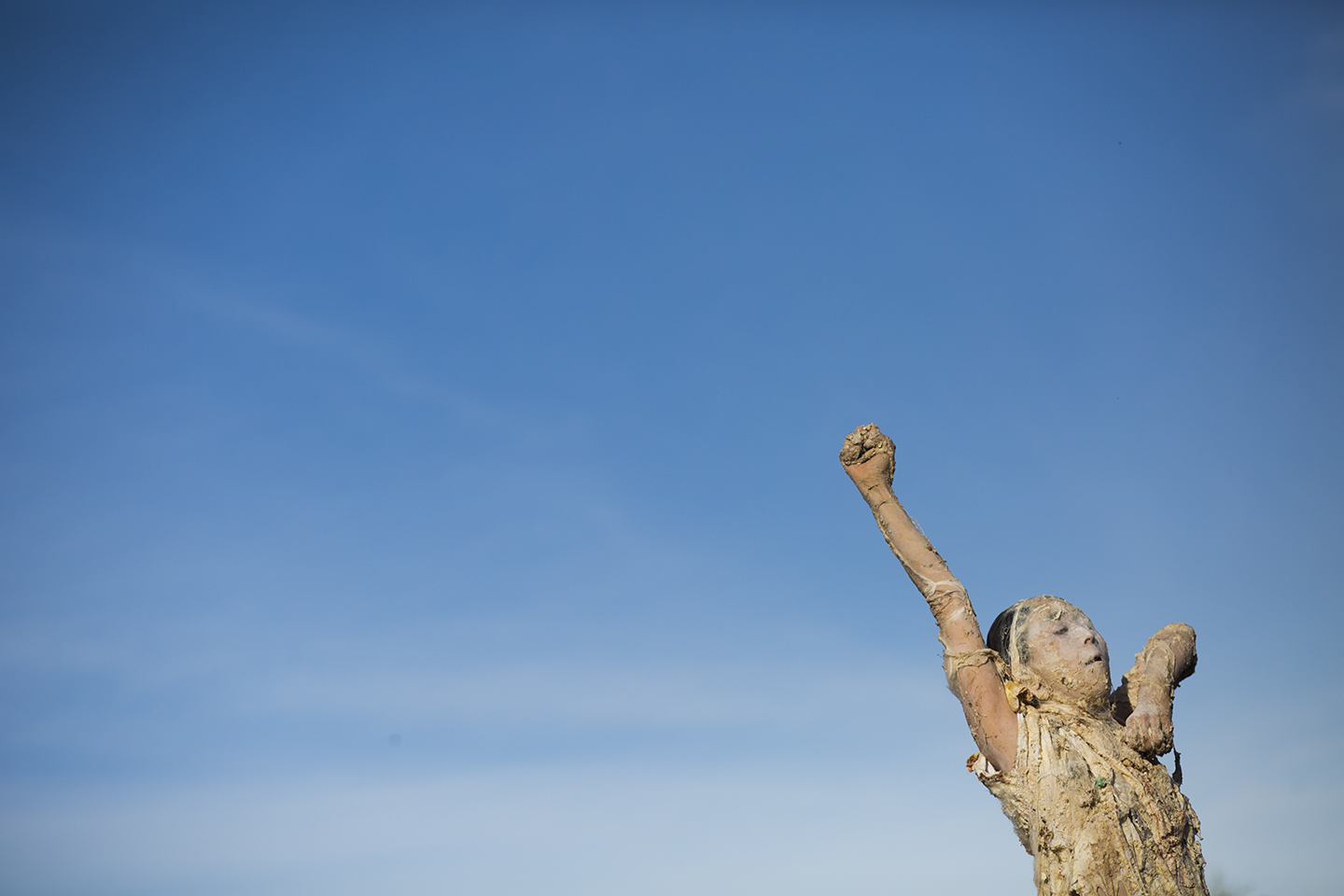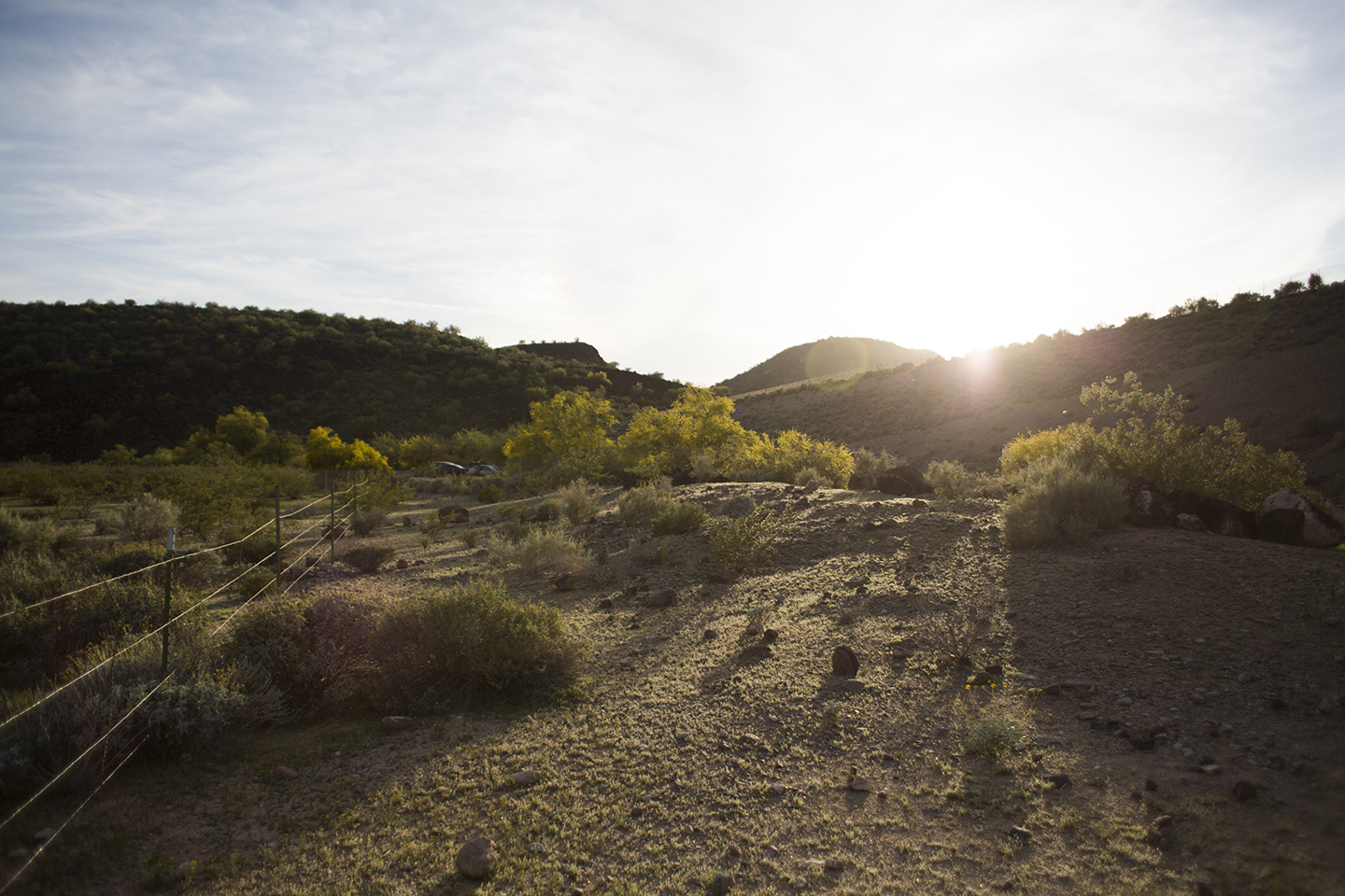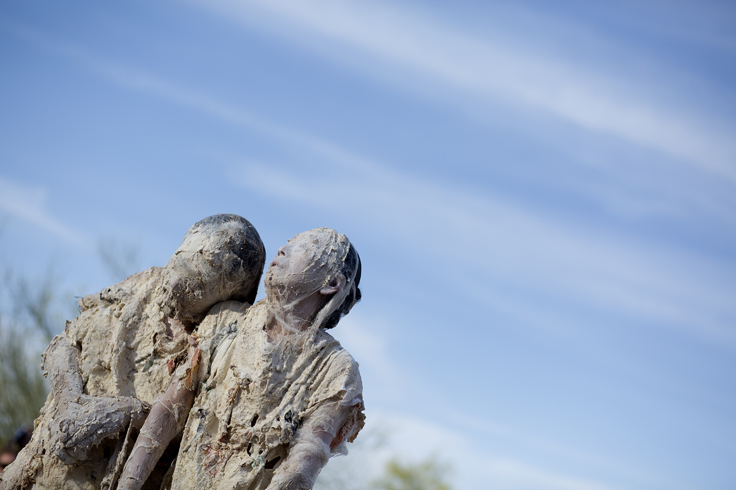 We were escorted as a group to the area the performance would take place. There was a small circle with a pile of dirt in the center covered in candles and Eiko laying still in the center in the bright sun. A large bunching of palo verde branches were piled into one area of the scene and dried pieces of ocotillo and wood created the performance space. Koma hobbled/walked into the circle with a large stick and candles lit on the end. He lit the cake of earth and slowly began to interact with Eiko. They had created three small wells, each holding different materials. The first water, secondly a white mud-like substance and lastly a powder. After some time they began to give each other first the water, then the mud and finally powdered themselves. Their movements were slow and akward, reminding me of a placid horror movie set in the Arizona desert. I couldn’t begin to understand the decisions governing each movement, but I found the point is for the viewer to create their own interpretation of the scene. I still don’t know what to think, two days after the performance, but I enjoyed the idea of utilizing such strange and alien movements in a performance. I suppose it makes you question the idea of what constitutes beauty in performance and provides you with more questions than answers.