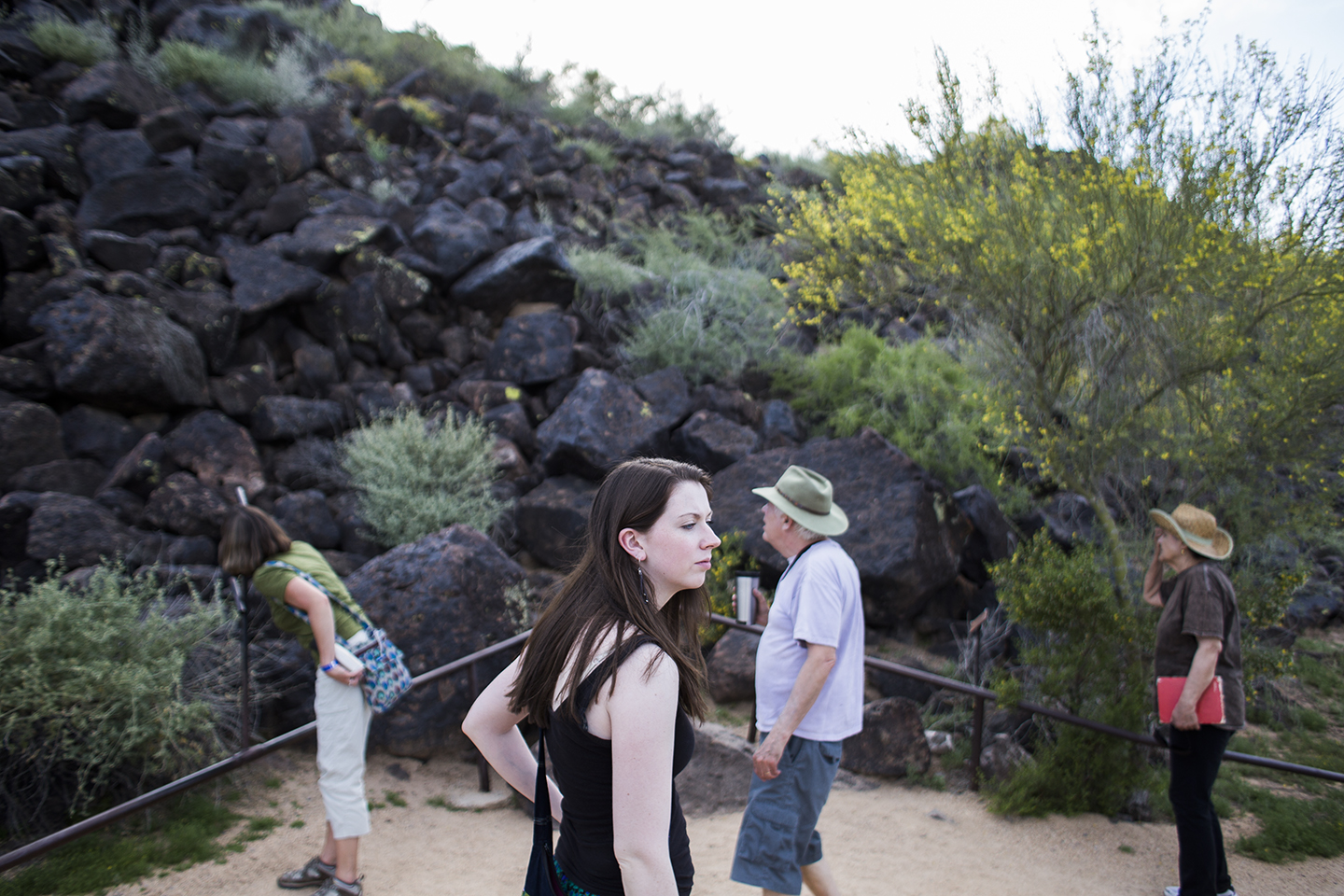 Have you ever heard of Butoh? Before Sunday’s performance of Desert Sightings at the Deer Valley Rock Art Center neither had I. Butoh first appeared in post World War II Japan and based in the idea of turning away from Western styles of dance, ballet and modern performance and to rediscover and redefine what it meant to be Japanese (1). Artists Eiko and Koma don’t characterize their work as Butoh, but claim Kazou Ohno, a pioneer in Butoh, as a main source of inspiration. Wikipedia describes the performance style as utilizing playful and grotesque imagery, extreme or absurd environments and using white body make up with hyper-controlled motion. I suppose this area of quiet desert with thousands of petroglyphs butting up at the edge of the city, seems a fittingly extreme and nearly absurd environment.