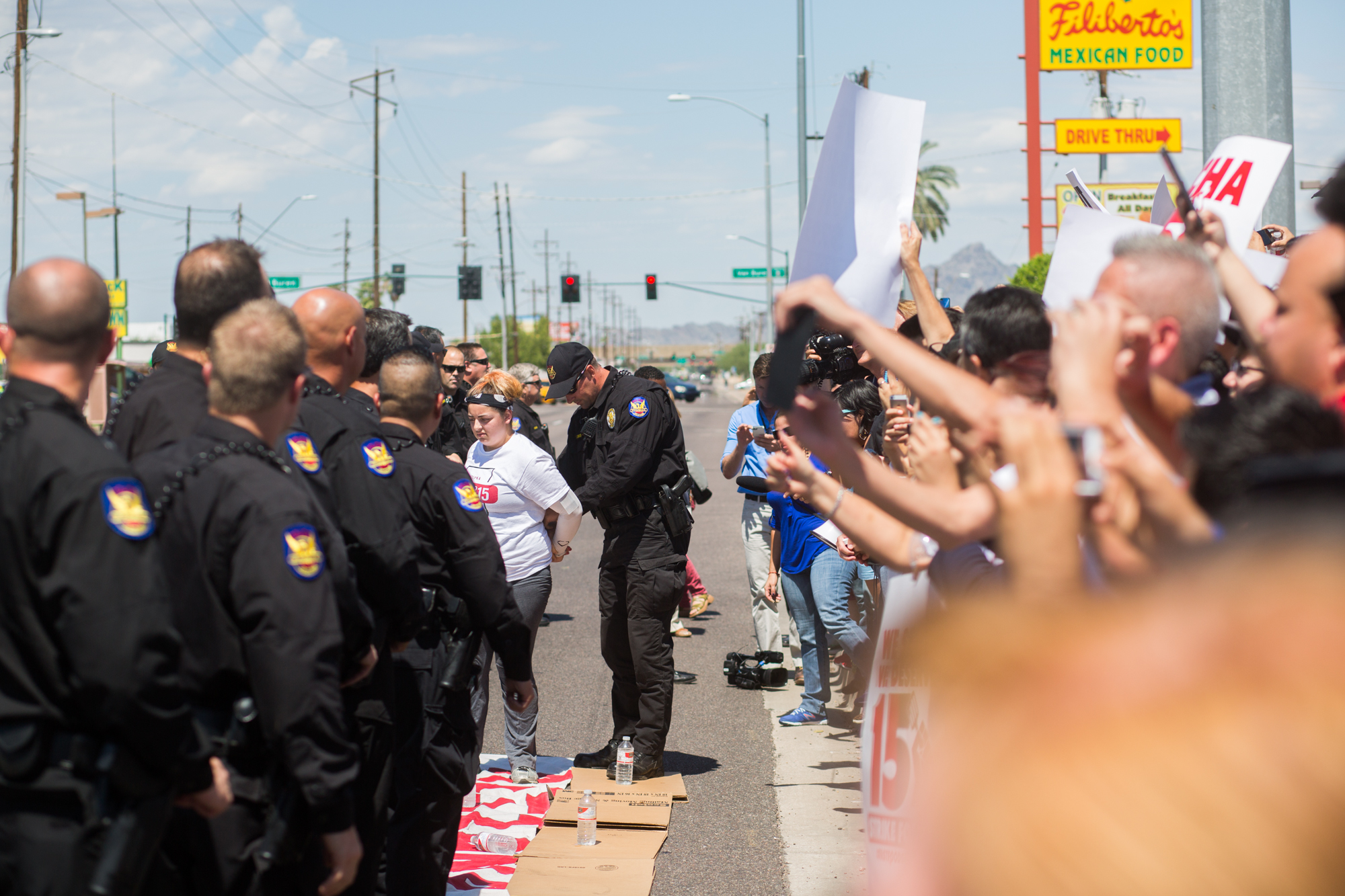 September 05, 2014 – Protesters gather in front of McDonald’s restaurant on 24th St. and Van Buren in Phoenix, Ariz. Four protesters were arrested while non-violently protesting in the street Thursday afternoon. Photo by Deanna Dent