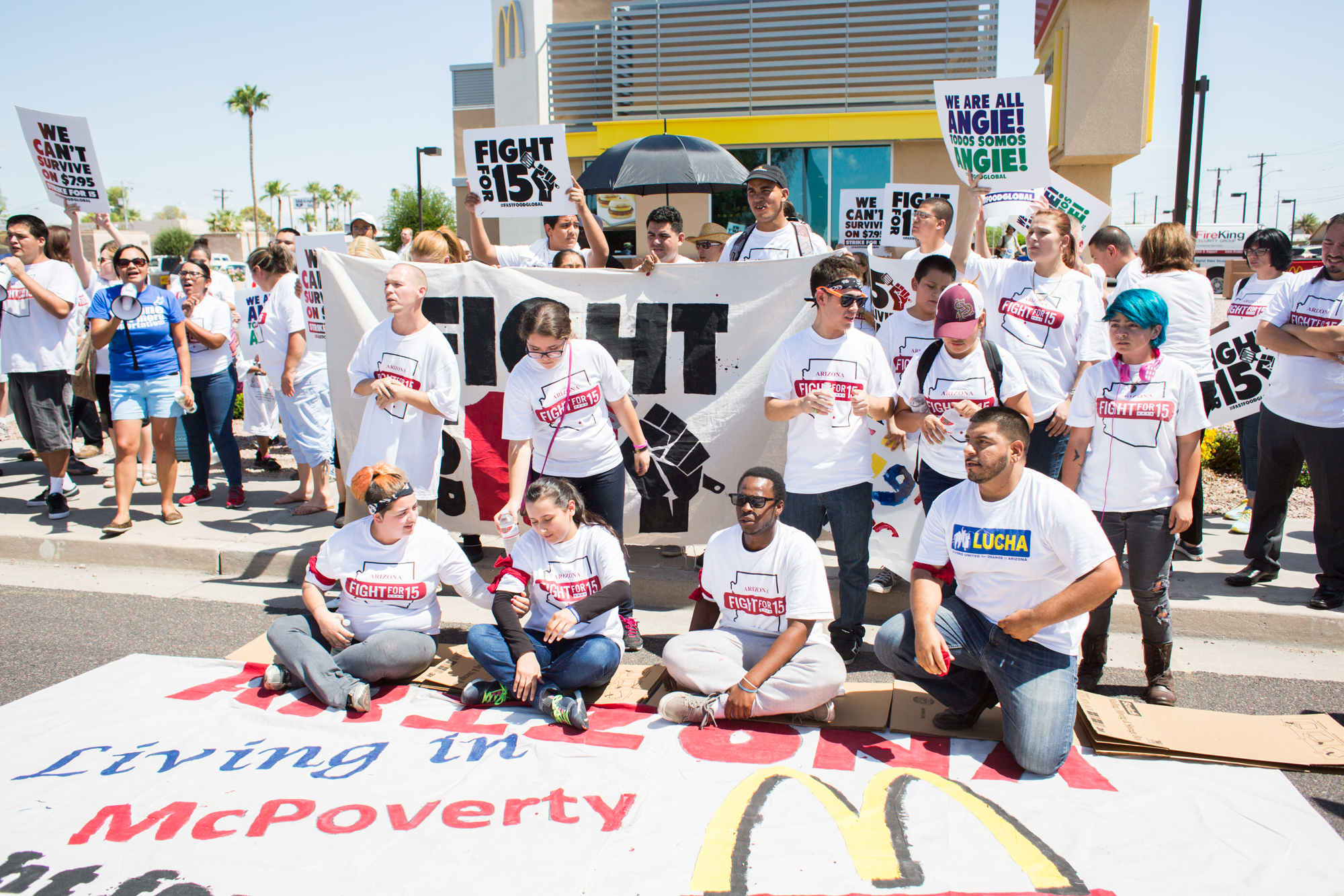 September 05, 2014 – Protesters gather in front of McDonald’s restaurant on 24th St. and Van Buren in Phoenix, Ariz. Four protesters were arrested while non-violently protesting in the street Thursday afternoon. Photo by Deanna Dent