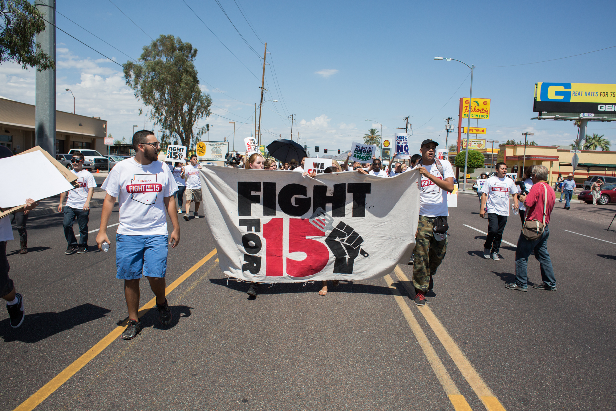 September 05, 2014 – Protesters gather in front of McDonald’s restaurant on 24th St. and Van Buren in Phoenix, Ariz. Four protesters were arrested while non-violently protesting in the street Thursday afternoon. Photo by Deanna Dent