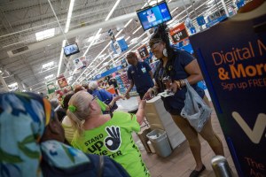 10152014 – Our Walmart protestors began by staging an action at the Walmart on 3721 E. Thomas Road in Phoenix, Ariz. Wednesday afternoon. Protestors asked for petition signatures and thanked employees for their work inside the store before heading to the home of Robert Walton, chairman of Walmart’s board of directors, in Paradise Valley, Ariz. Protestors held a demonstration and delivered the petition to the home of the chairman. Photo by Deanna Dent