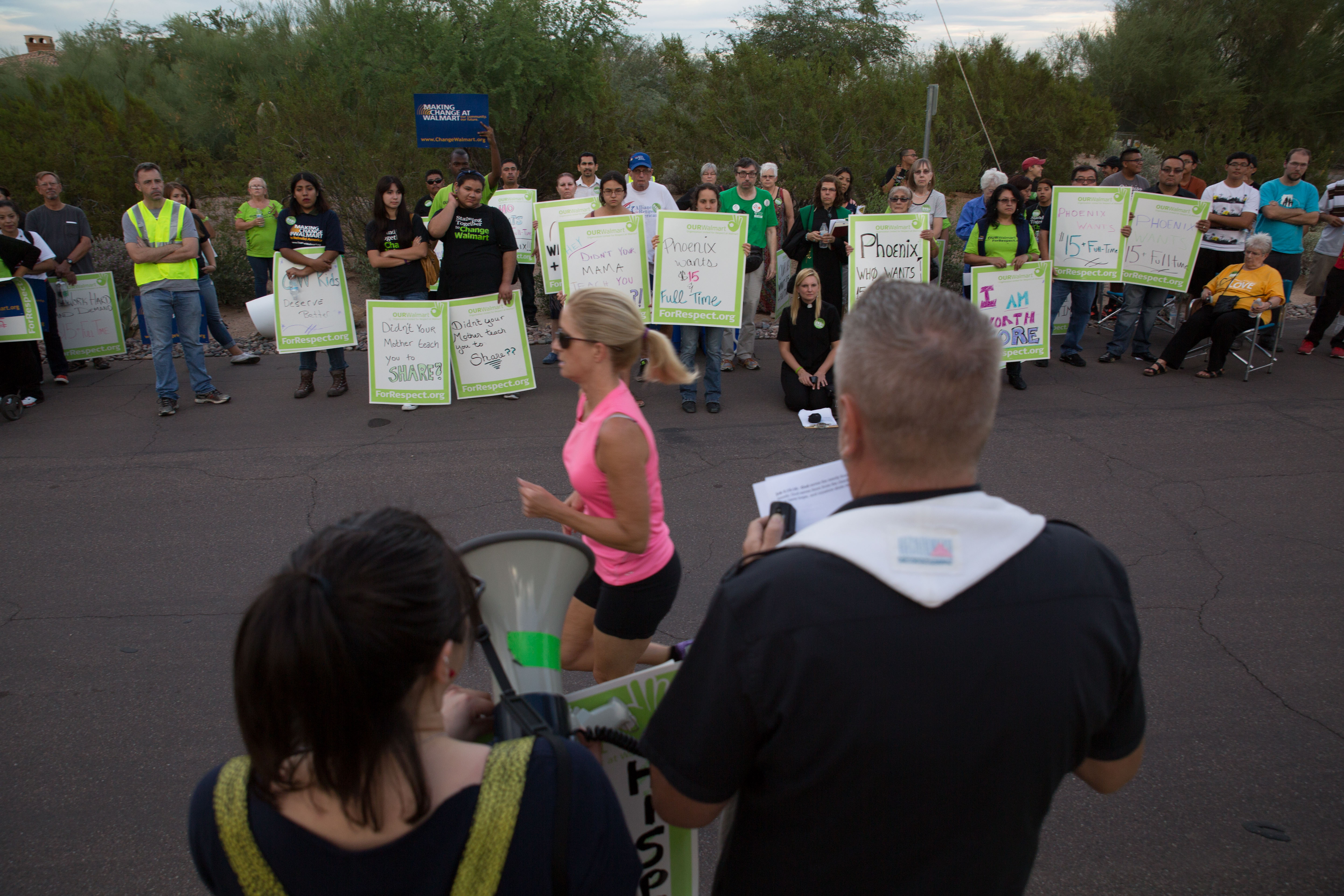 10152014 – Our Walmart protestors began by staging an action at the Walmart on 3721 E. Thomas Road in Phoenix, Ariz. Wednesday afternoon. Protestors asked for petition signatures and thanked employees for their work inside the store before heading to the home of Robert Walton, chairman of Walmart’s board of directors, in Paradise Valley, Ariz. Protestors held a demonstration and delivered the petition to the home of the chairman. Photo by Deanna Dent