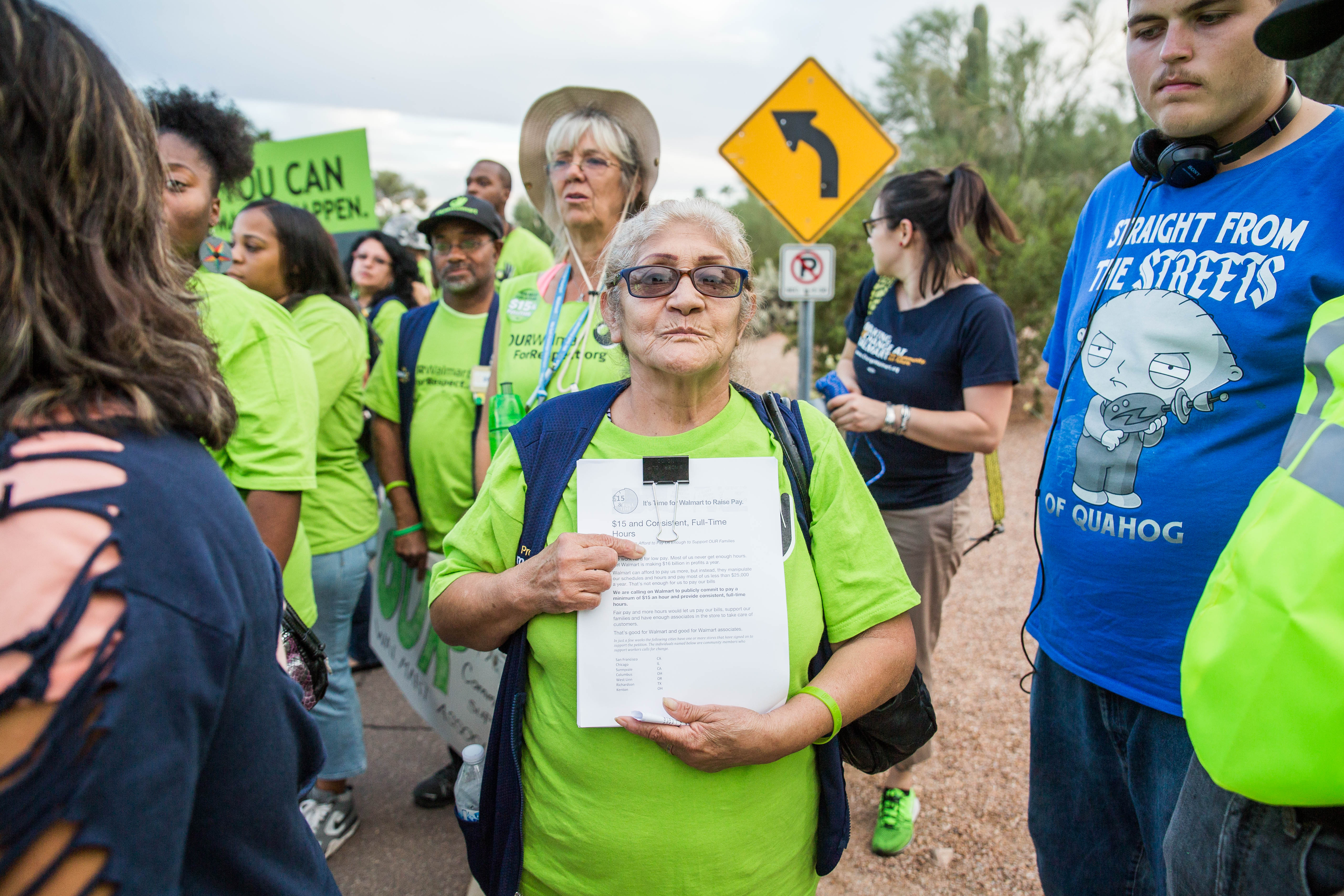 10152014 – Our Walmart protestors began by staging an action at the Walmart on 3721 E. Thomas Road in Phoenix, Ariz. Wednesday afternoon. Protestors asked for petition signatures and thanked employees for their work inside the store before heading to the home of Robert Walton, chairman of Walmart’s board of directors, in Paradise Valley, Ariz. Protestors held a demonstration and delivered the petition to the home of the chairman. Photo by Deanna Dent