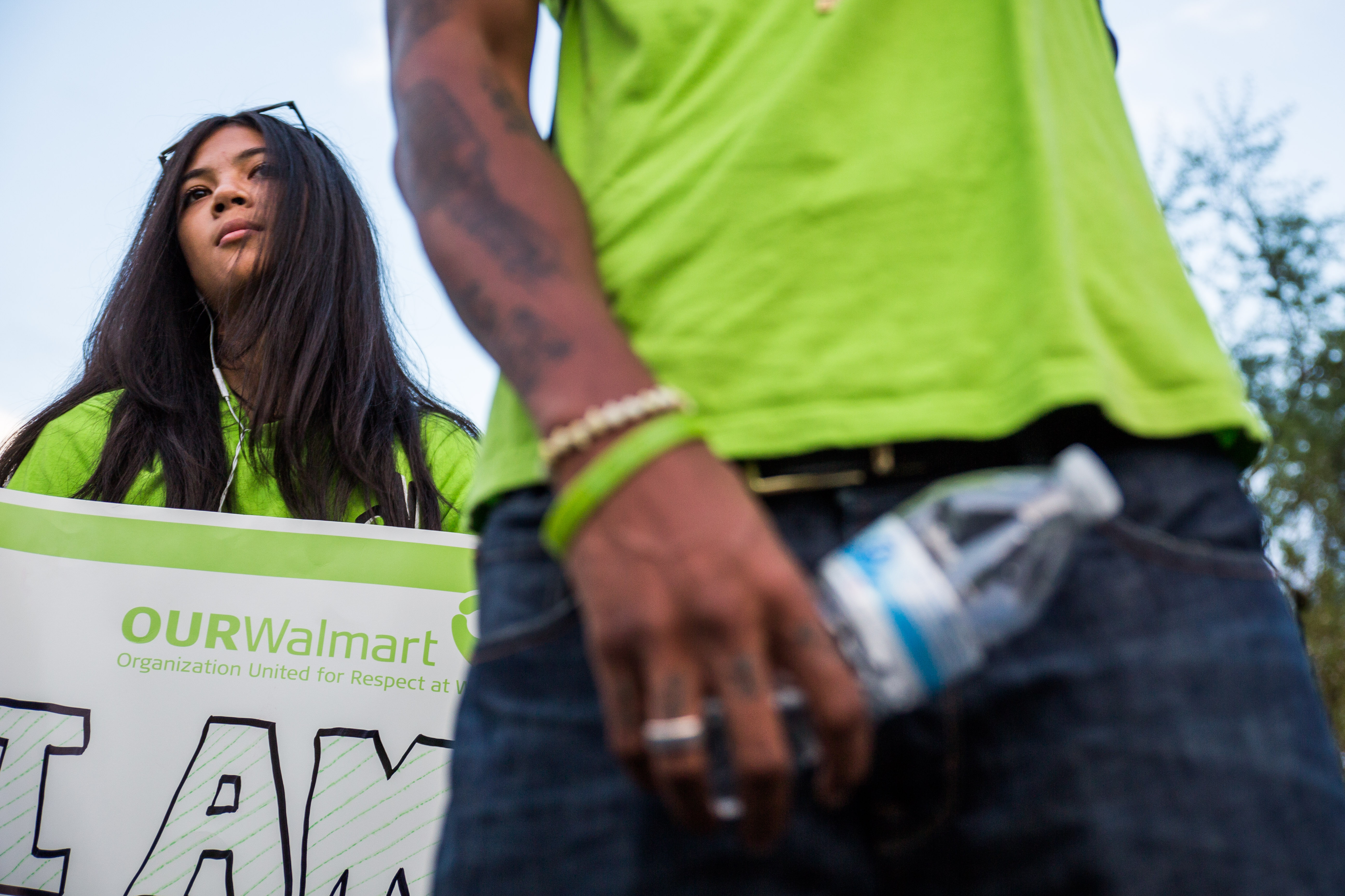 10152014 – Our Walmart protestors began by staging an action at the Walmart on 3721 E. Thomas Road in Phoenix, Ariz. Wednesday afternoon. Protestors asked for petition signatures and thanked employees for their work inside the store before heading to the home of Robert Walton, chairman of Walmart’s board of directors, in Paradise Valley, Ariz. Protestors held a demonstration and delivered the petition to the home of the chairman. Photo by Deanna Dent
