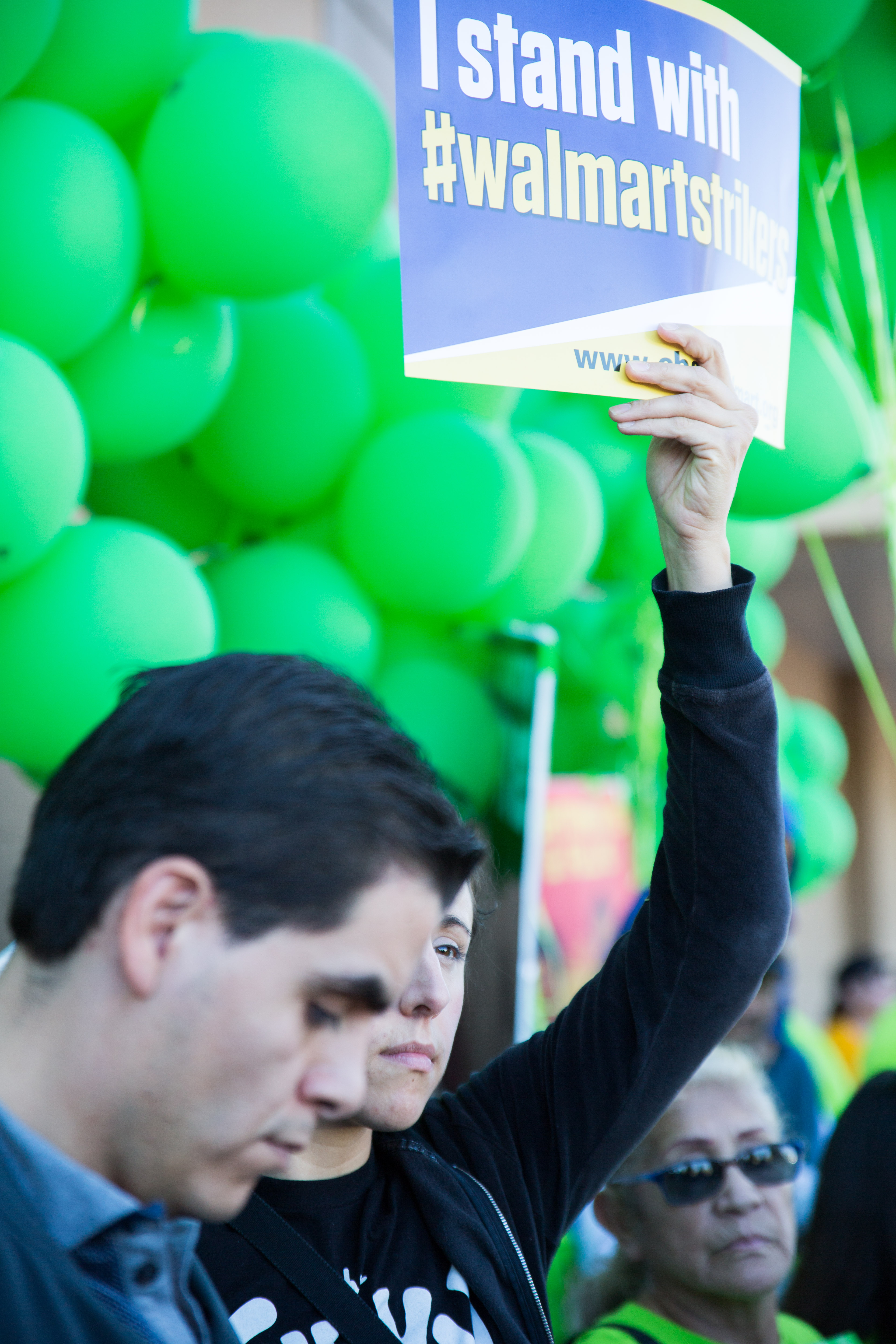 11282014 – Protestors and Walmart employees on strike demonstrated outside a Walmart story on Thomas Road and 32nd Street in Phoenix, Ariz. Friday afternoon. Protestors, including local Walmart staff on strike, were fighting for higher wages and better benefits. Photo by Deanna Dent