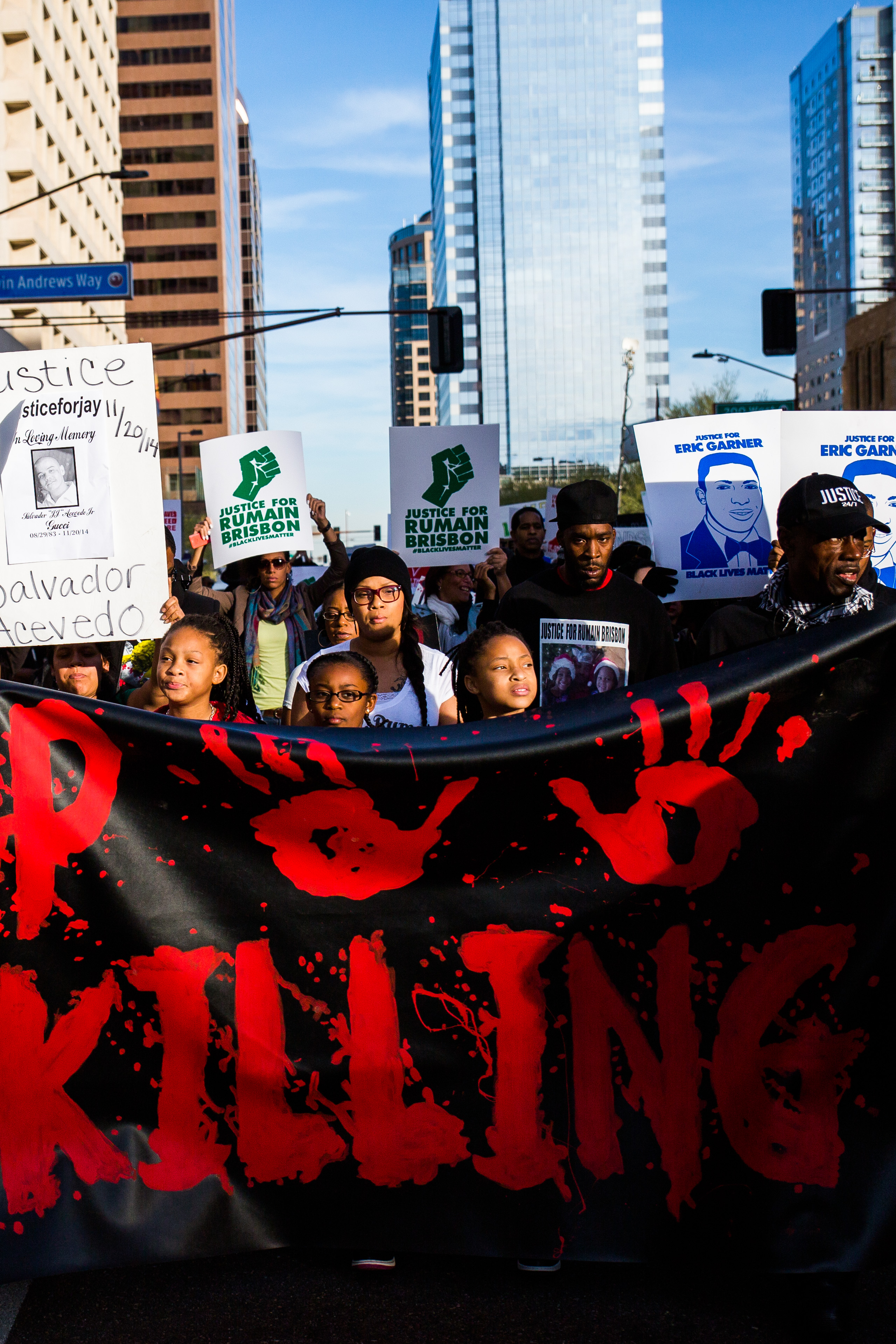 20141220 – Protestors marched and held die-ins throughout Phoenix Saturday afternoon in protest of shootings and lack of indictments throughout the previous months focusing on Phoenix cases of Rumain Brisbon, Michelle Cusseaux and Salvador Reza. Photo by Deanna Dent