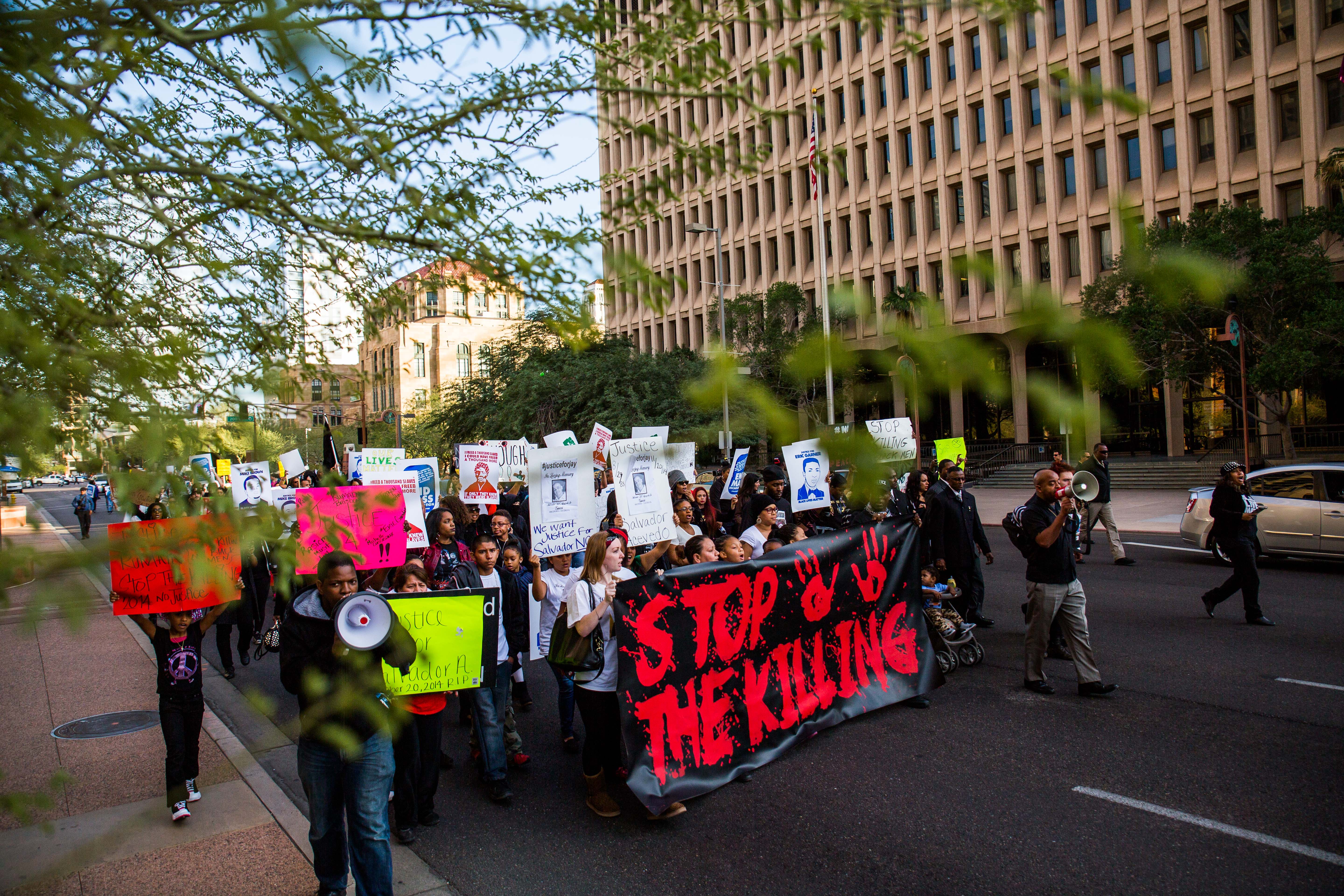 20141220 – Protestors marched and held die-ins throughout Phoenix Saturday afternoon in protest of shootings and lack of indictments throughout the previous months focusing on Phoenix cases of Rumain Brisbon, Michelle Cusseaux and Salvador Reza. Photo by Deanna Dent
