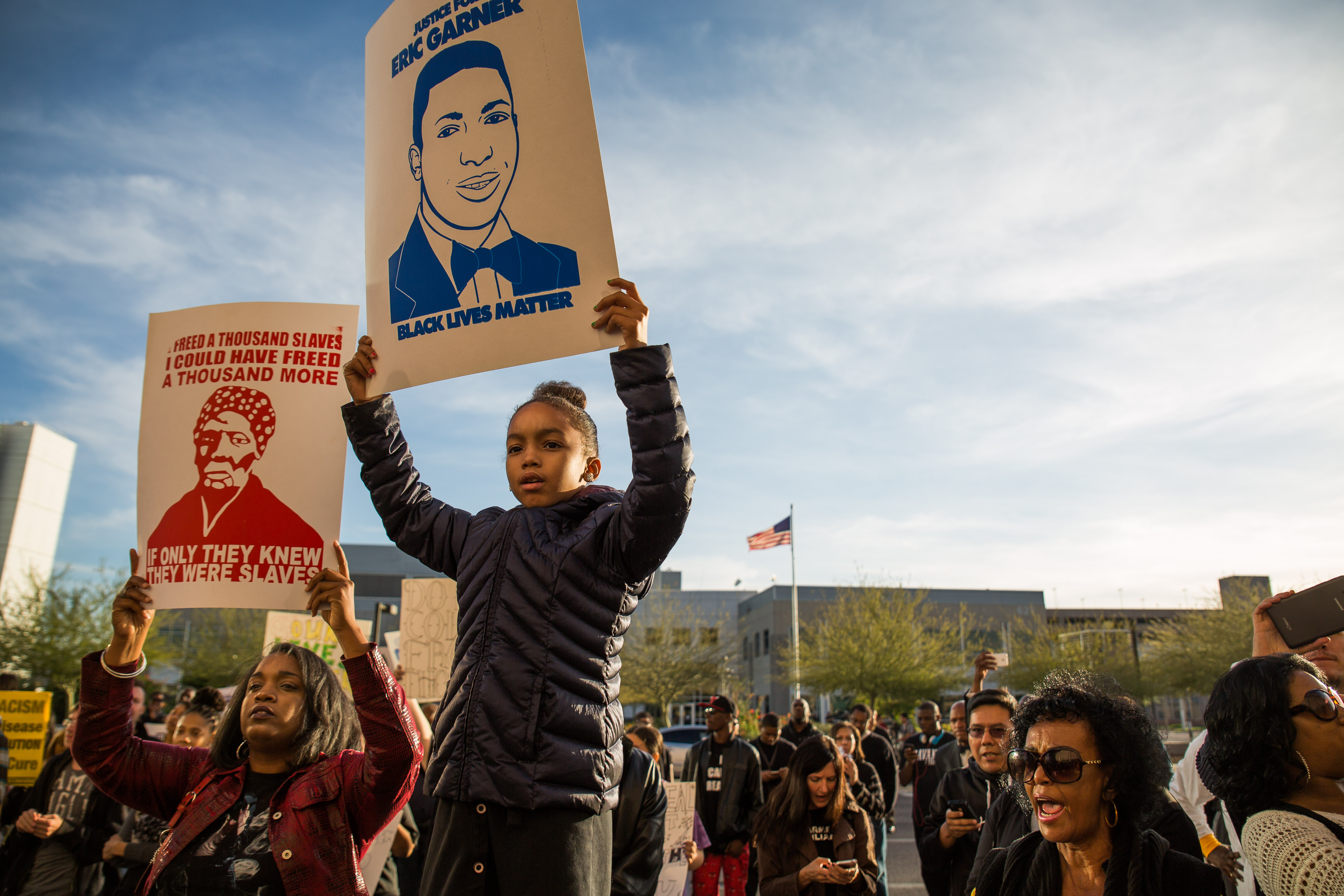 20141220 – Protestors marched and held die-ins throughout Phoenix Saturday afternoon in protest of shootings and lack of indictments throughout the previous months focusing on Phoenix cases of Rumain Brisbon, Michelle Cusseaux and Salvador Reza. Photo by Deanna Dent