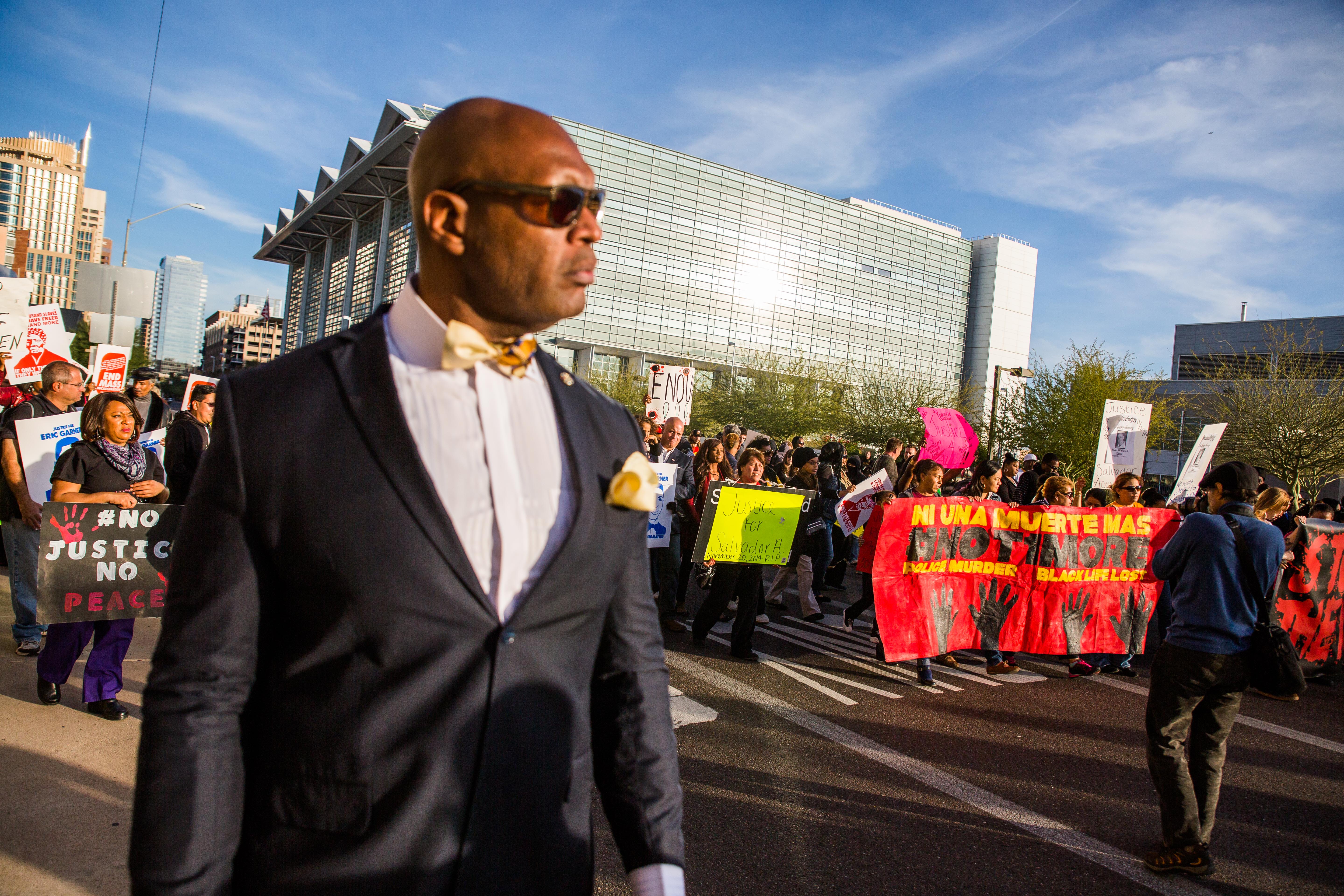 20141220 – Protestors marched and held die-ins throughout Phoenix Saturday afternoon in protest of shootings and lack of indictments throughout the previous months focusing on Phoenix cases of Rumain Brisbon, Michelle Cusseaux and Salvador Reza. Photo by Deanna Dent