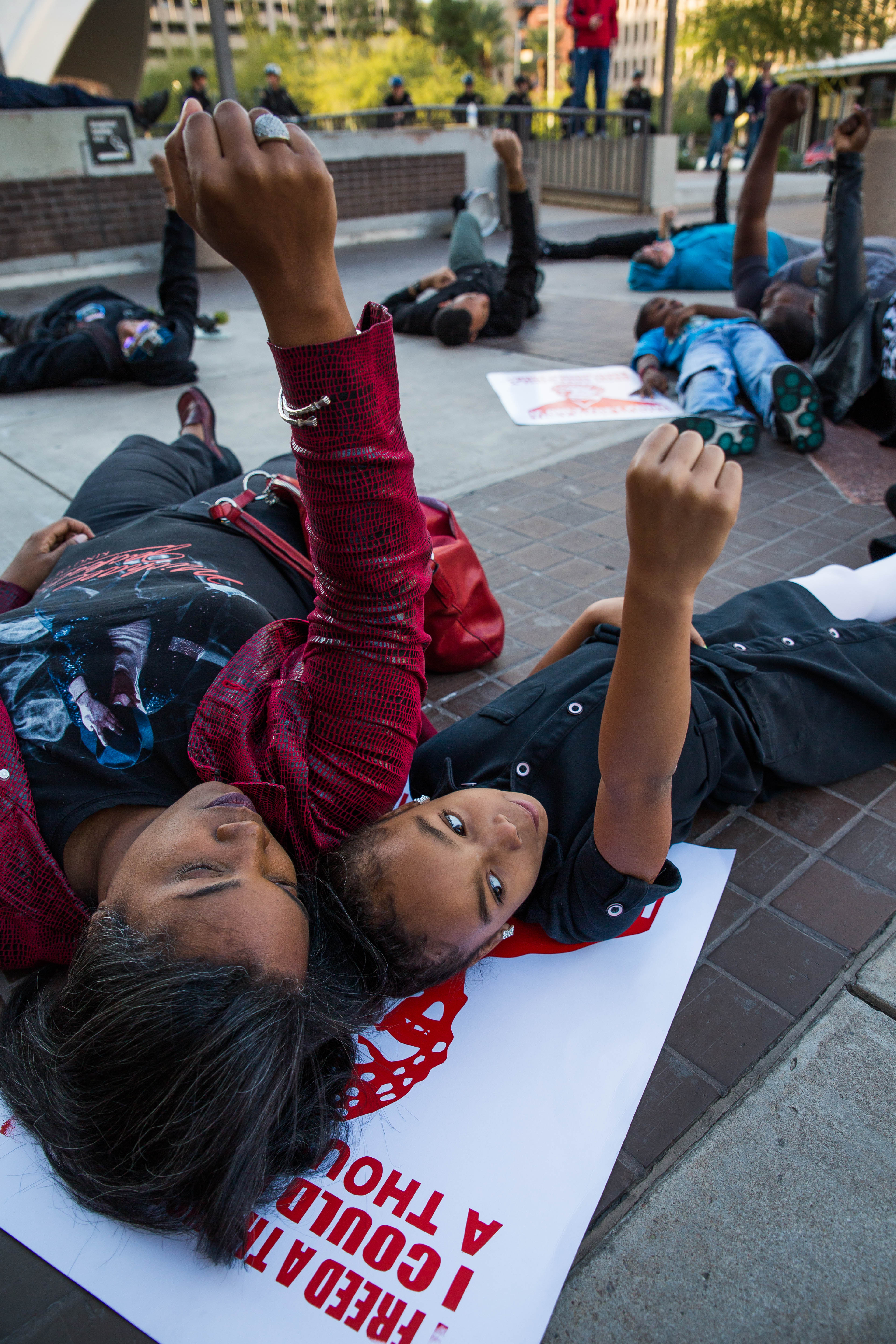 20141220 – Protestors marched and held die-ins throughout Phoenix Saturday afternoon in protest of shootings and lack of indictments throughout the previous months focusing on Phoenix cases of Rumain Brisbon, Michelle Cusseaux and Salvador Reza. Photo by Deanna Dent