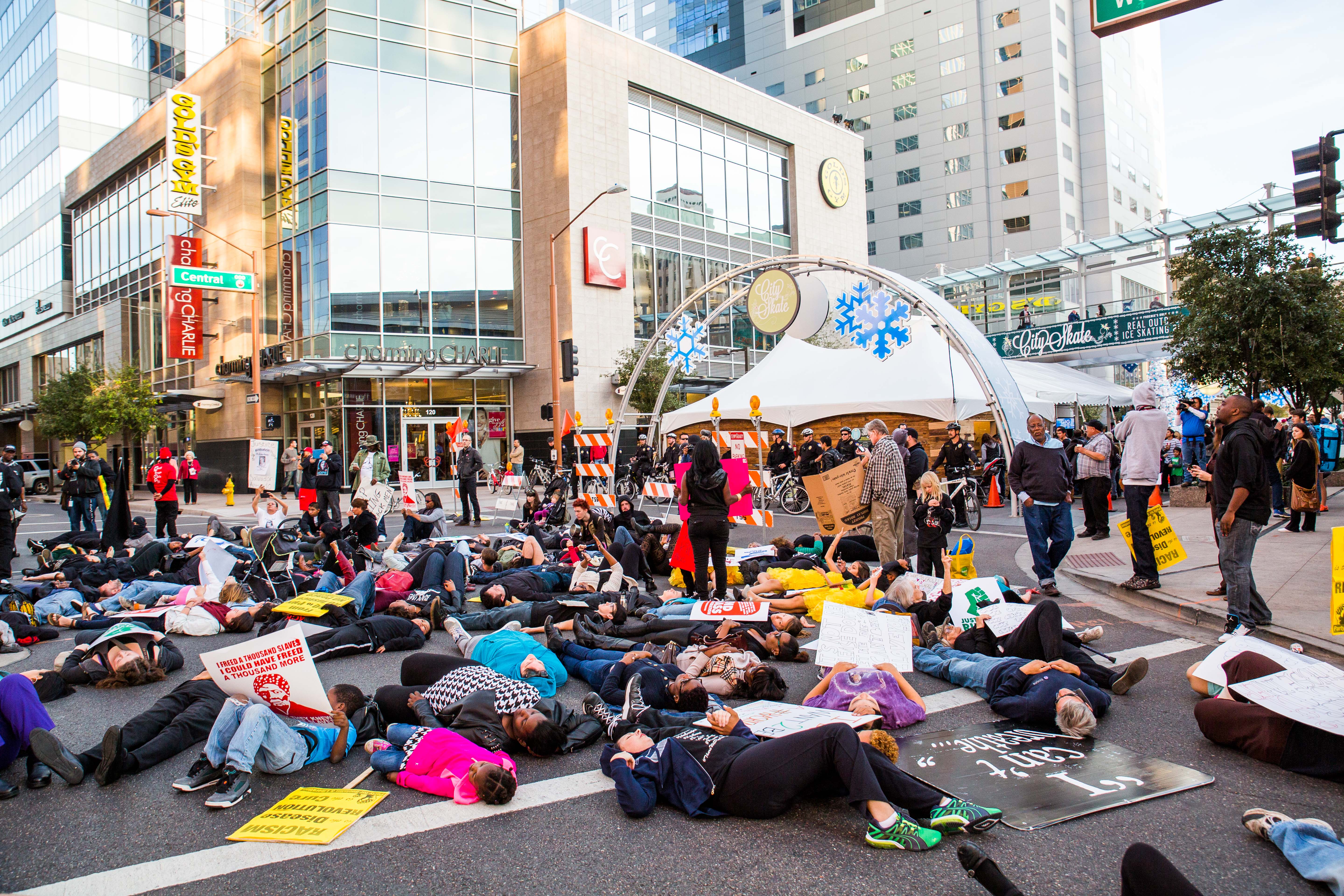 20141220 – Protestors marched and held die-ins throughout Phoenix Saturday afternoon in protest of shootings and lack of indictments throughout the previous months focusing on Phoenix cases of Rumain Brisbon, Michelle Cusseaux and Salvador Reza. Photo by Deanna Dent