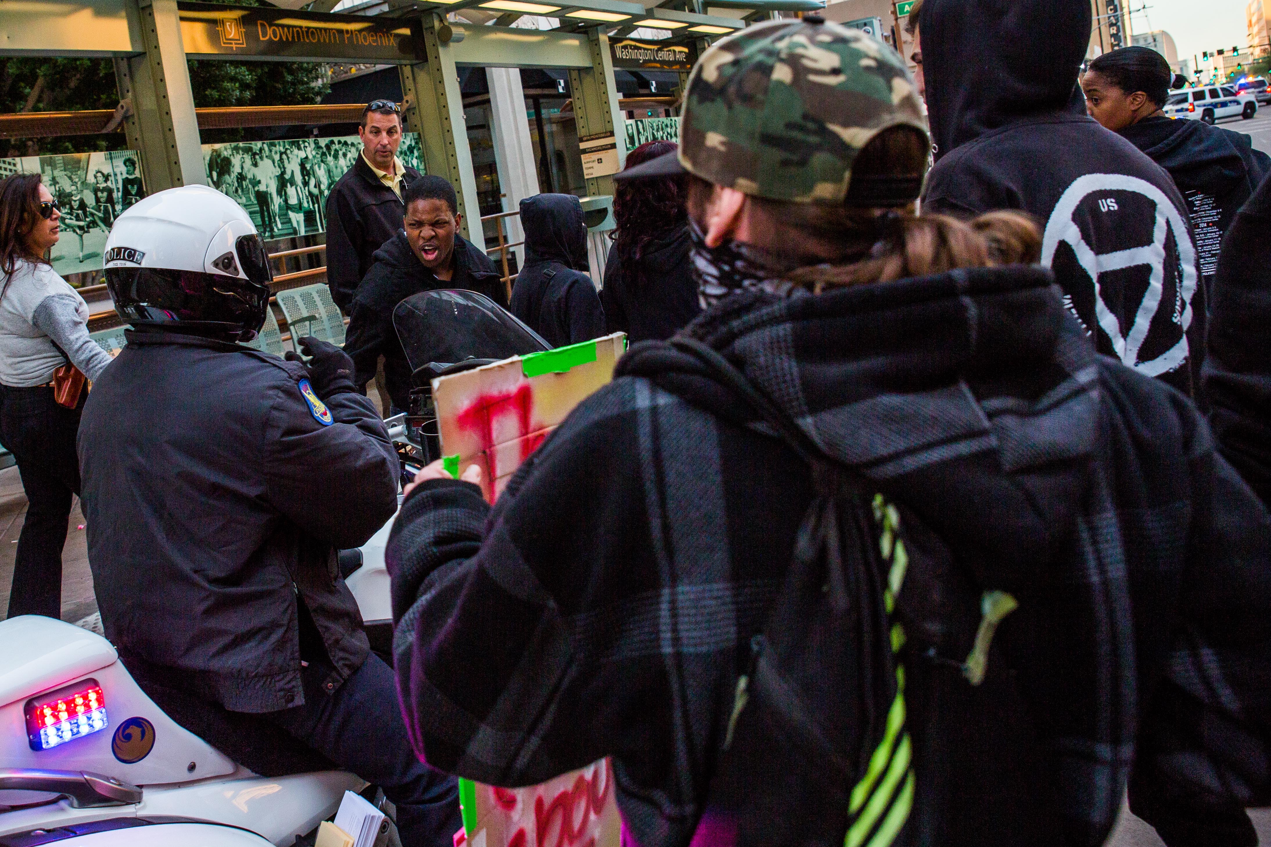 20141220 – Protestors marched and held die-ins throughout Phoenix Saturday afternoon in protest of shootings and lack of indictments throughout the previous months focusing on Phoenix cases of Rumain Brisbon, Michelle Cusseaux and Salvador Reza. Photo by Deanna Dent