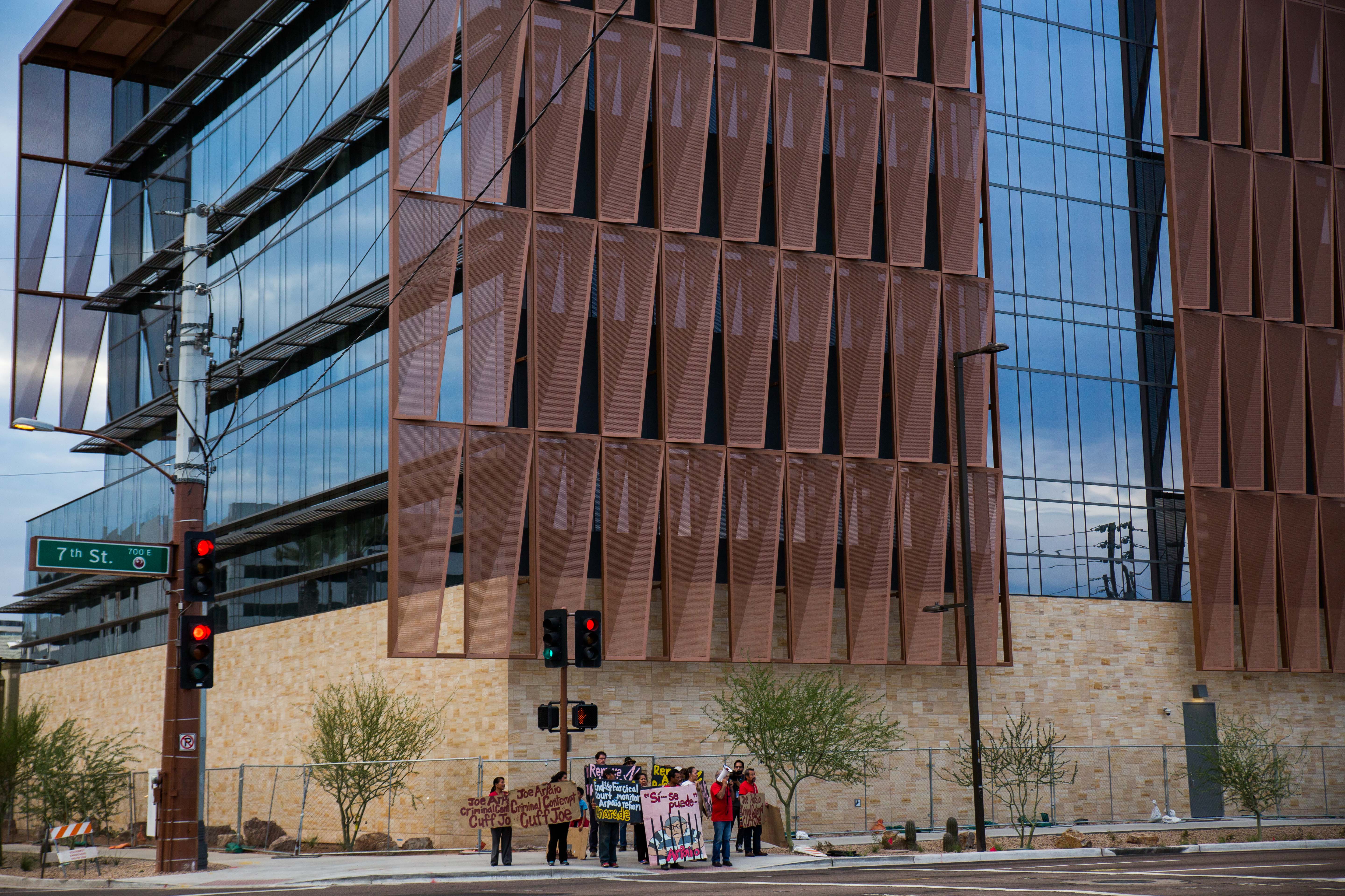 Protestors cross 7th Street and Filmore while protesting Maricopa County Sheriff Joe Arpaio Wednesday evening in downtown Phoenix. Sheriff Arpaio made an appearance at the court appointed monitor community meeting to listen to complaints of the community at ASU