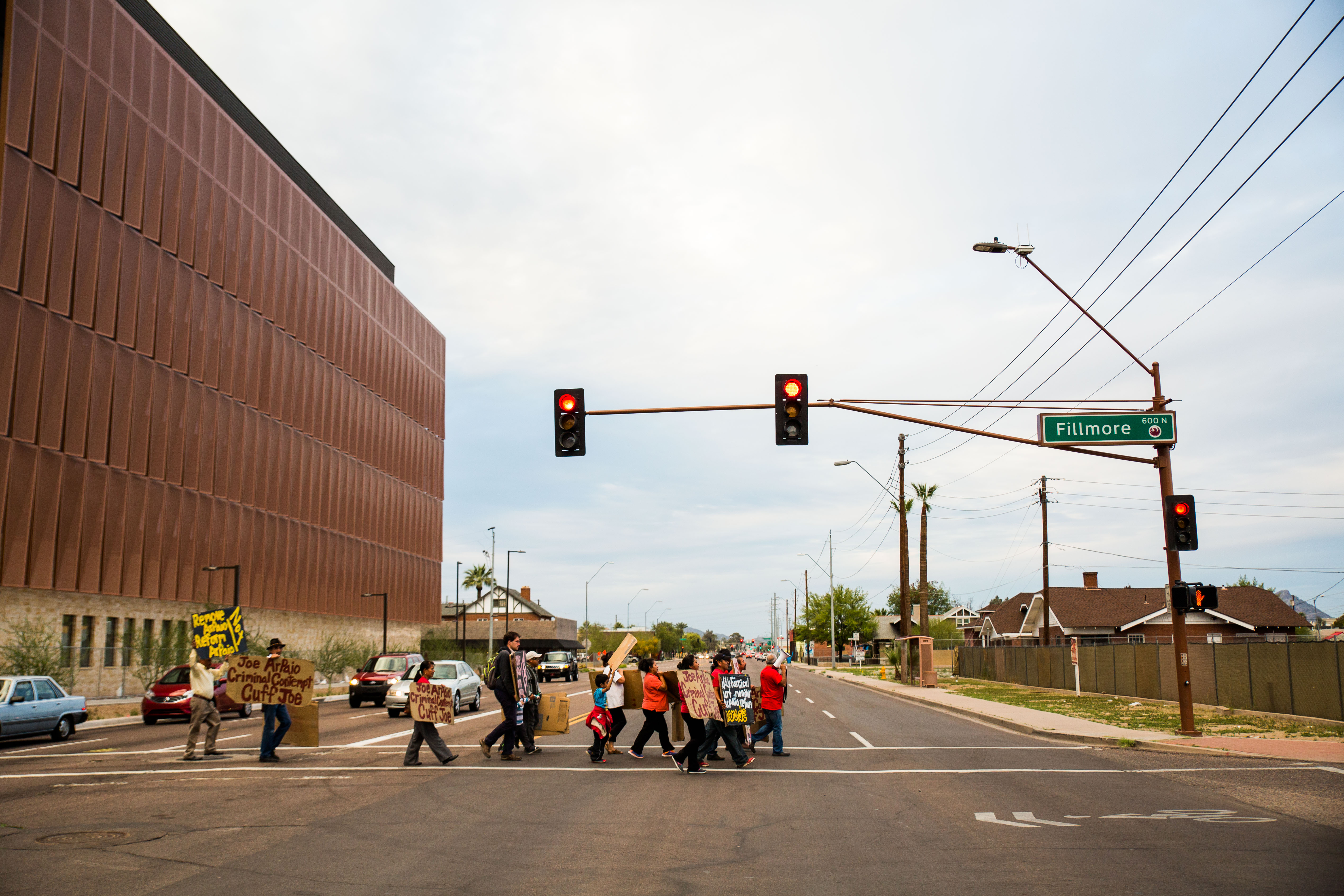 Protestors cross 7th Street and Filmore while protesting Maricopa County Sheriff Joe Arpaio Wednesday evening in downtown Phoenix. Sheriff Arpaio made an appearance at the court appointed monitor community meeting to listen to complaints of the community at ASU