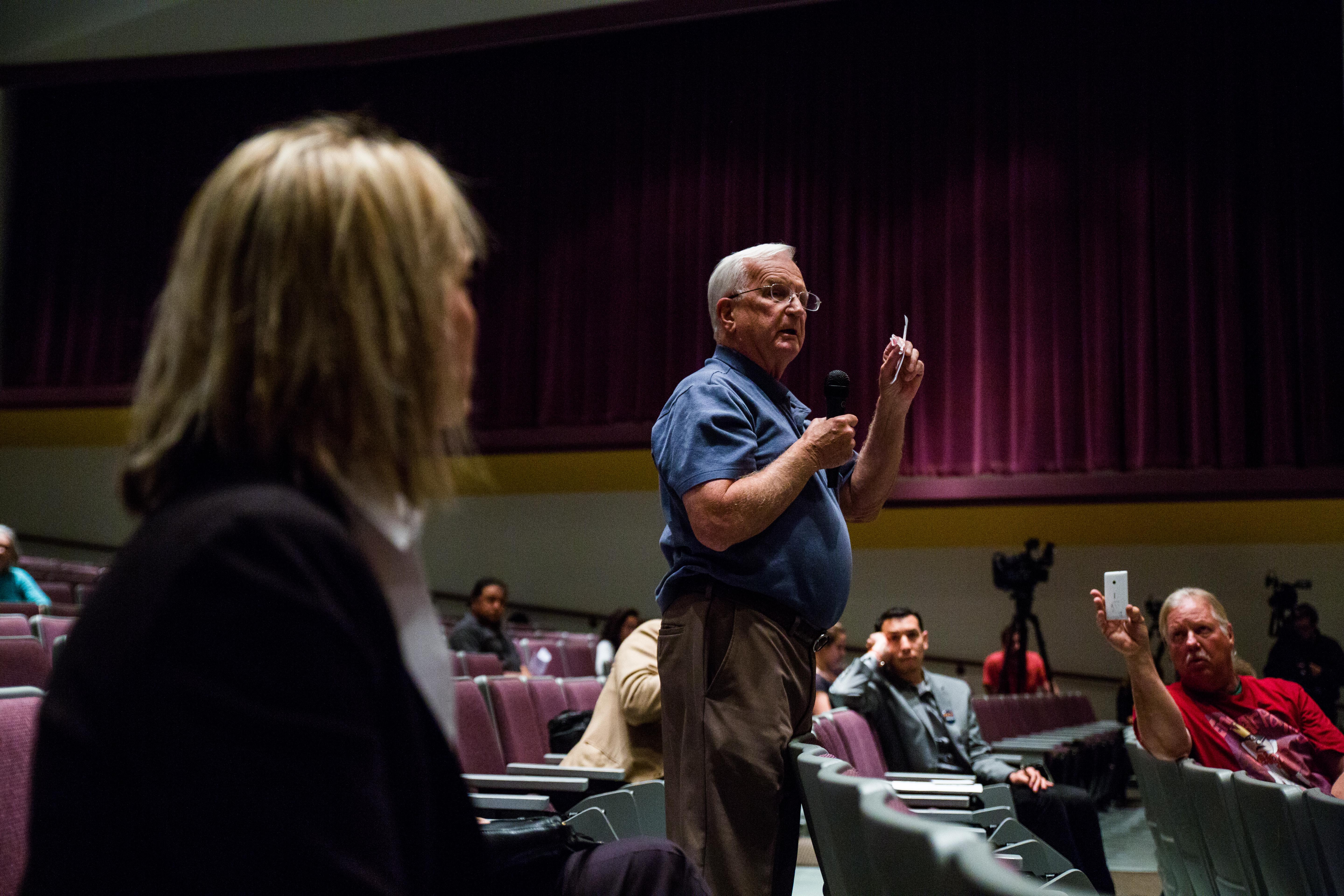 Dr. George Pauk airs his grievances at a court appointed monitor meeting at ASU prep academy and was attended Maricopa County Sheriff Joe Arpaio Wednesday evening in downtown Phoenix. Community members were invited to give their input on their experiences with MCSO to the court appointed monitor. Photo by Deanna Dent