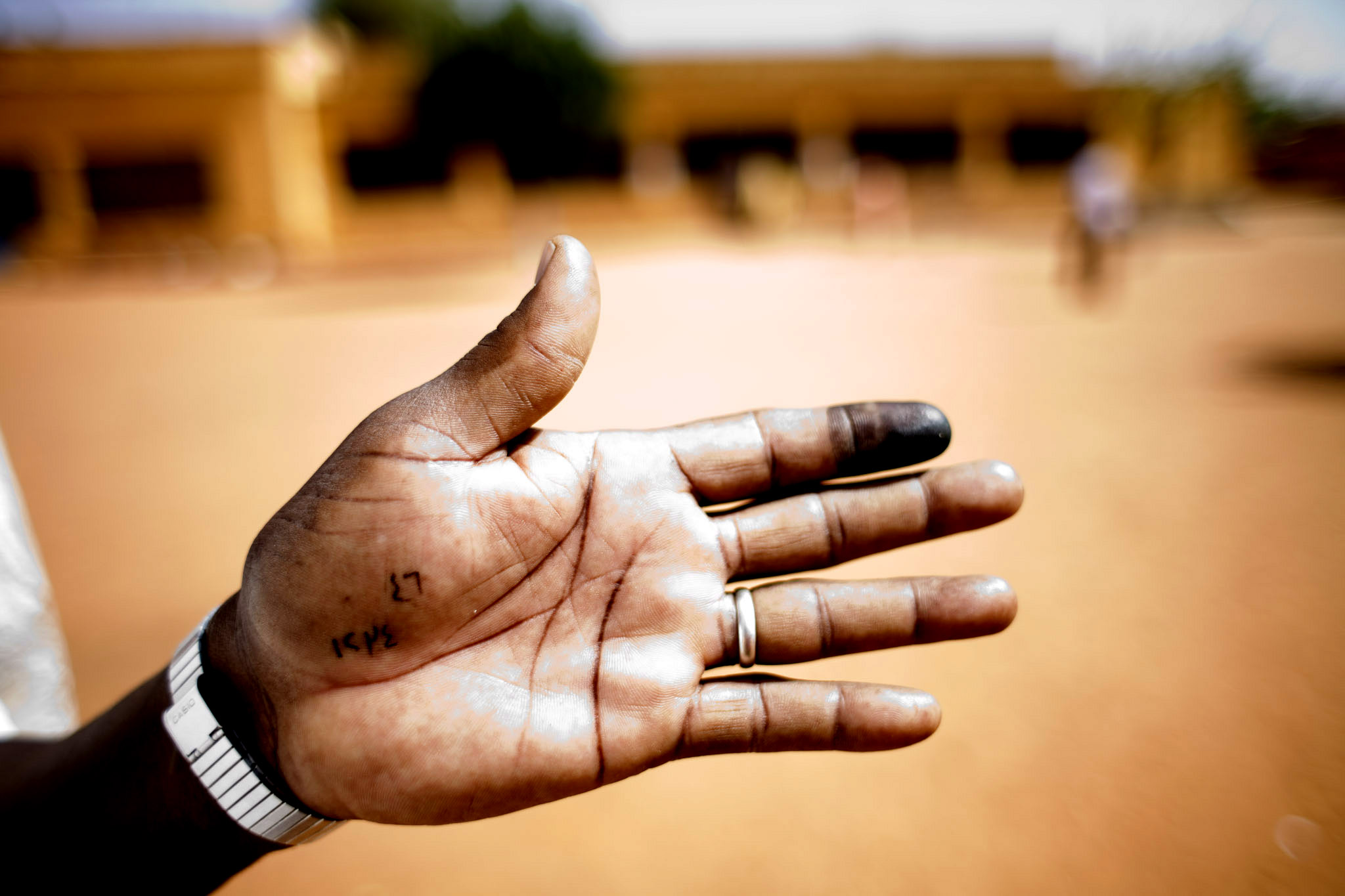 A man shows his hand where he has written his voter registration number and dipped his index finger in ink to prove he has voted in El Obeid, North Kordofan State, Sudan.