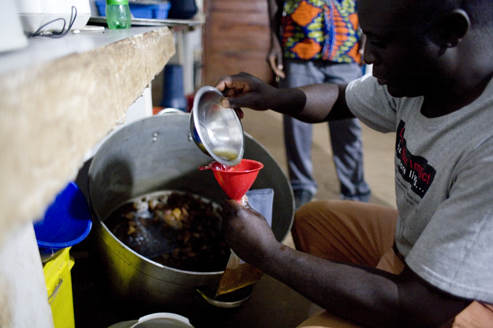 Once the oil is rendered, we pour it into bottles and collect the fried pork skins into a bucket.