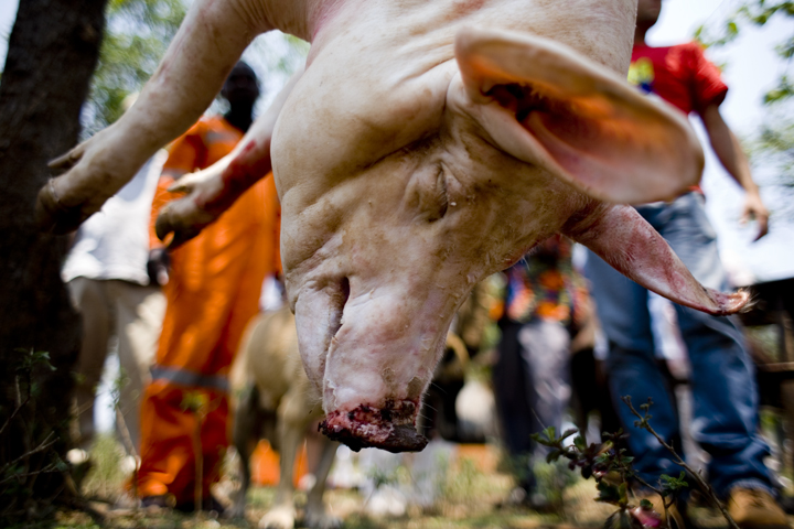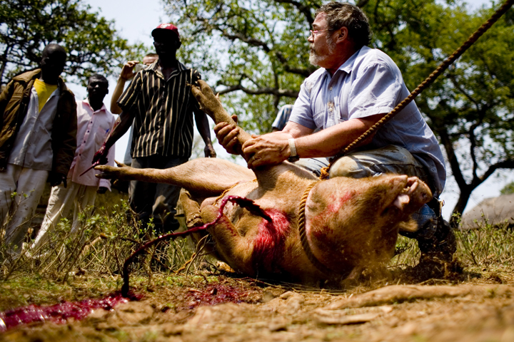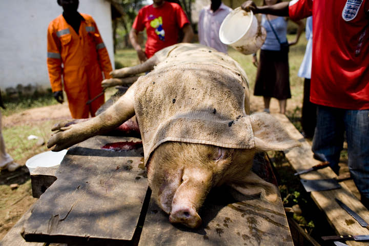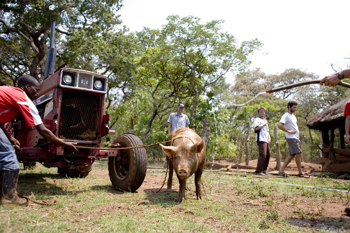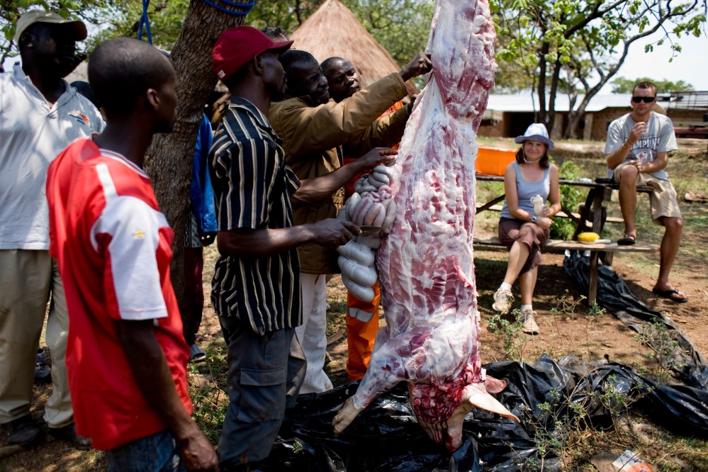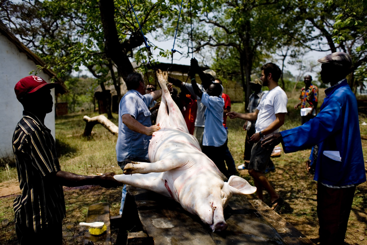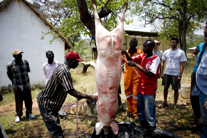 The first day of the training at Mujila Falls Farm we organized a tour of the training center and butchering a 150 kg pig. In Zambia some things are done differently, unlike the picture above where we inserted the knife into the heart of the pig so it bleeds out immediately, most here bludgeon the pig or slit its throat. They also don’t hang the pig and remove the fat, which can then be rendered down into salatie. This pig produced 20 liters of salatie, buckets of pork rinds and several kgs of meat.